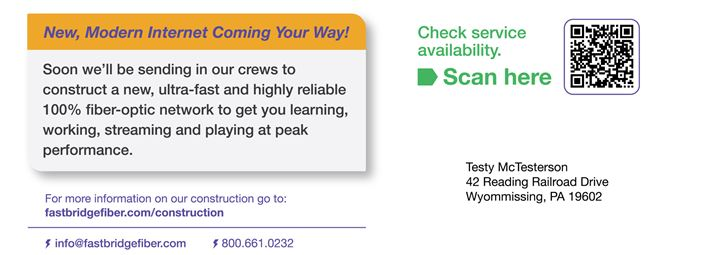 Fastbridge Fiber has begun construction in the Town of Bloomsburg. They are installing their 100% fiber-optic network. The crew will be working within public rights-of-way and utility easements that may be located on your property. Their goal is to minimize the disruption and complete construction quickly. Any issues, please inform the Town’s Public Works Department at: 570-784-2300.